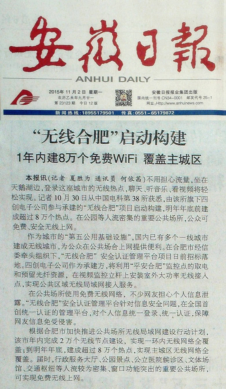 【媒體視角】新華網(wǎng)、安徽日報等多家媒體報道四創(chuàng)電子承建“無線合肥”平臺項(xiàng)目