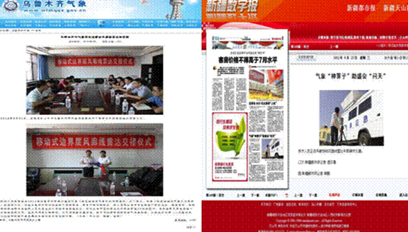 8月下旬,四創(chuàng)公司移動式邊界層風(fēng)廓線雷達在烏魯木齊順利舉行交車儀式,烏魯木齊市氣象局對整個系統(tǒng)進行了性能測試、功能演示,滿足合同技戰(zhàn)術(shù)指標(biāo)要求。該雷達成功交付后即參與第二屆中國—亞歐博覽會的現(xiàn)場氣象服務(wù)工作。8月底,移動式風(fēng)廓線雷達正式入駐博覽會,開展氣象監(jiān)測工作。在工作中,風(fēng)廓線雷達、視頻監(jiān)控與地面觀測系統(tǒng)24小時不間斷運行,采集的數(shù)據(jù)信息與市氣象局共享,為組委會提供了短期、精細化的氣象預(yù)報。